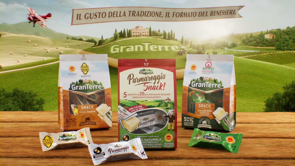 GranTerre, an outstanding Italian company which specialises in mature cheeses and cured meats is showcasing for the first time on the big screen its new entire range of GranTerre snacks. The new ad is part of the “Il Tagliere delle grandi bontà” (Board of great goodness) – a project, created by the Armando Testa agency, and, in addition to celebrating the Parmareggio Snack, it introduces two new references: Grana Padano and Asiago Stagionato snacks.